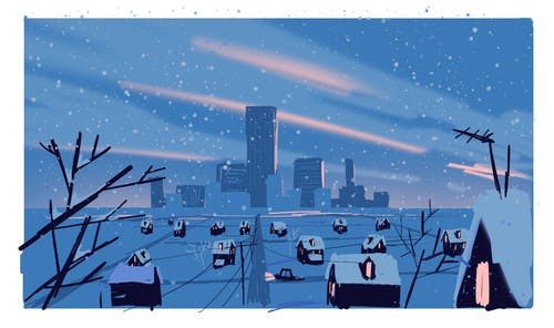 For the environments, we studied images of cities and towns across the United States to concept three non-specific settings that would nevertheless illustrate the difference in regions.